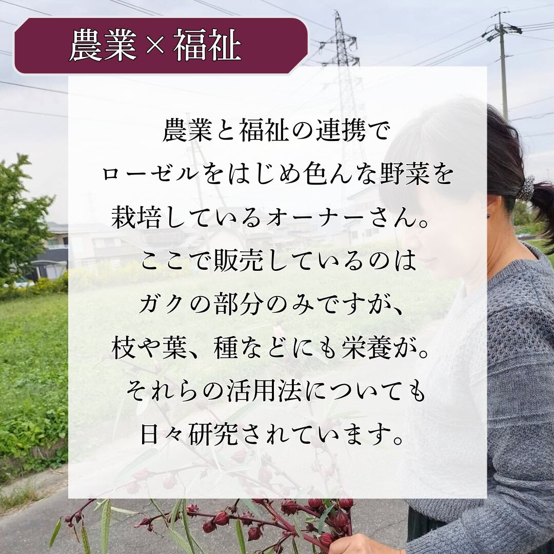 ■温暖な津島市が育む: 沖縄に匹敵するほどの高い気温を誇る愛知県津島市は、ローゼルが最も美味しく育つ環境です。その津島市で大切に育てられたローゼルを丁寧に乾燥させました。