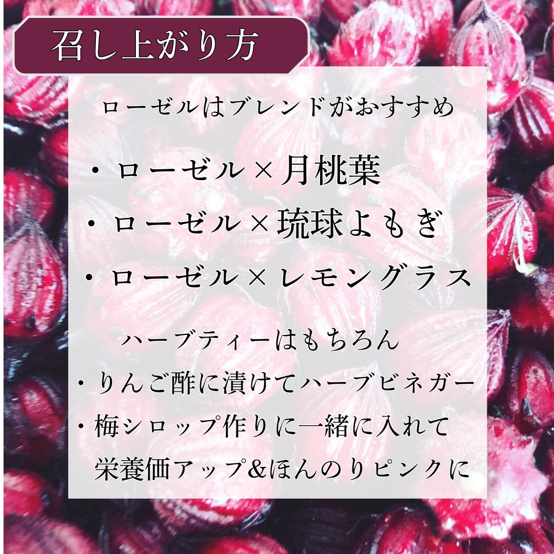 ハーブティーとしてはもちろん、お料理のアクセントや、自家製シロップの材料としてもおすすめです。色鮮やかなルビー色と、豊かな風味をぜひお楽しみください。