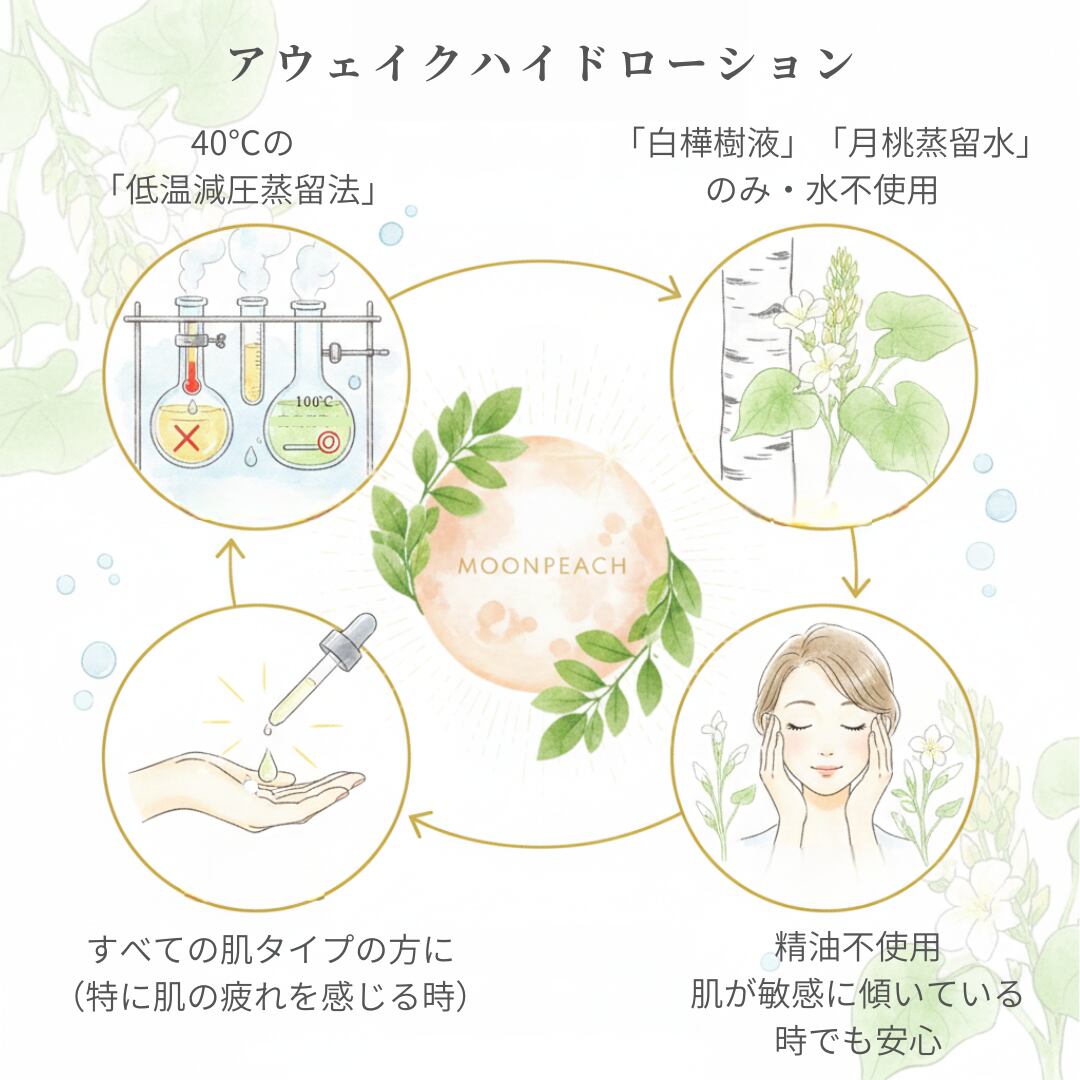 アウェイクハイドローションは、水(精製水)を一切使わず、「白樺樹液」と「月桃蒸留水」だけで作り上げた、100%植物由来の美容水です。