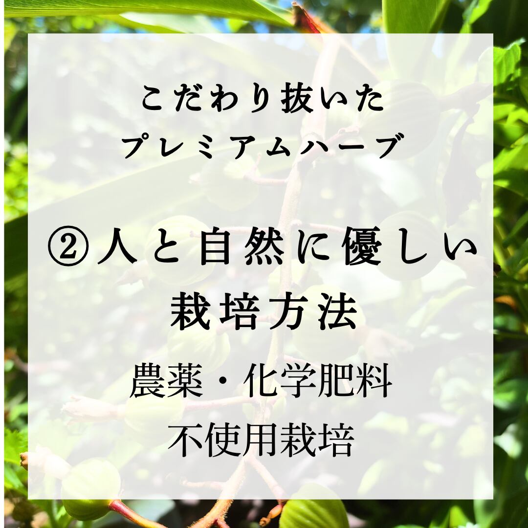 愛知県産と宮古島産、どちらも健康と環境に配慮し、農薬や化学肥料を使わずに育てられたハーブのみを使用しています。自然の力を最大限に引き出した、安心安全なティーをお届けします。