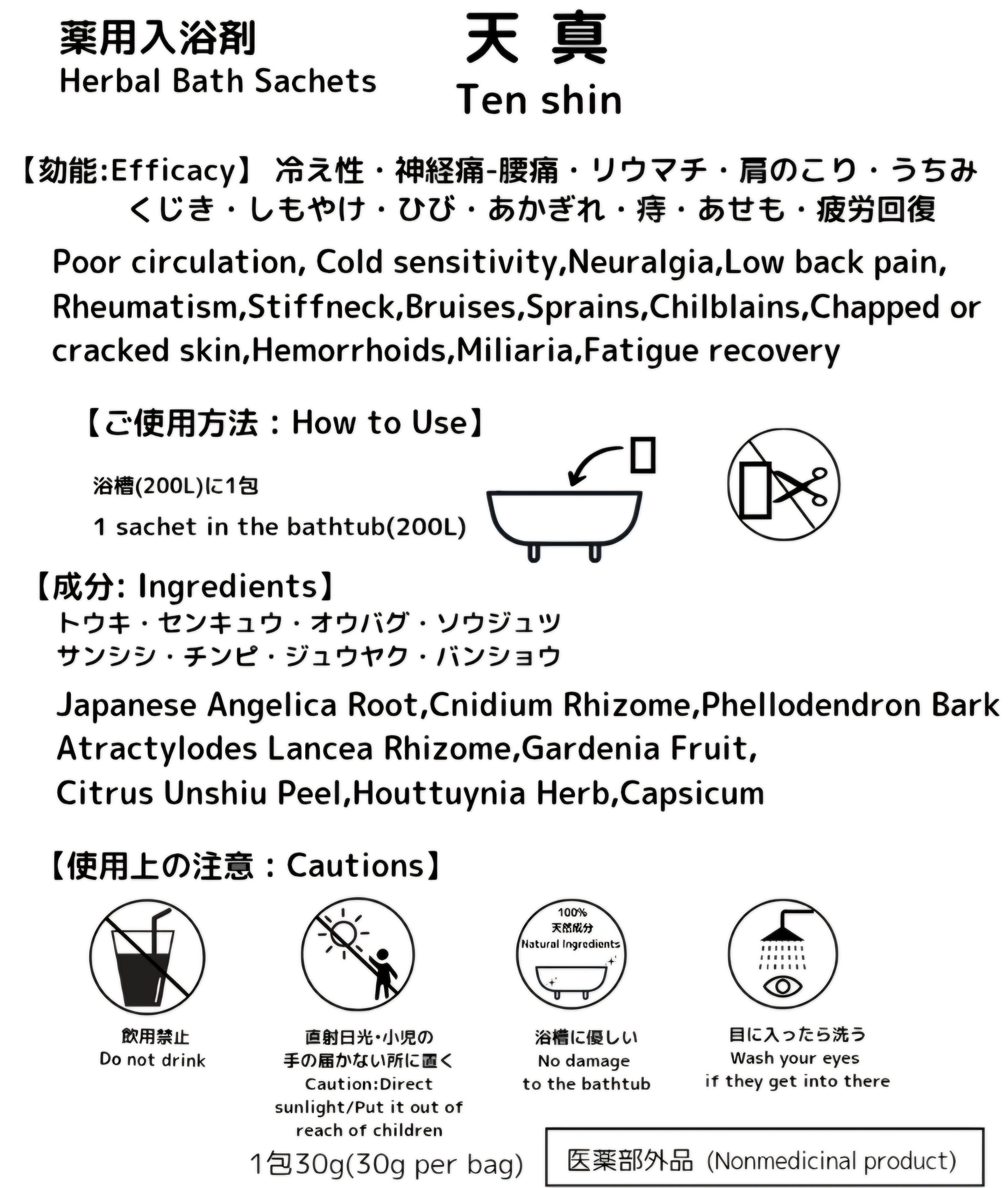 あせも、荒れ性、うちみ、くじき、肩のこり、神経痛、しっしん、しもやけ、痔、冷え症、腰痛、リウマチ、疲労回復、ひび、あかぎれなど