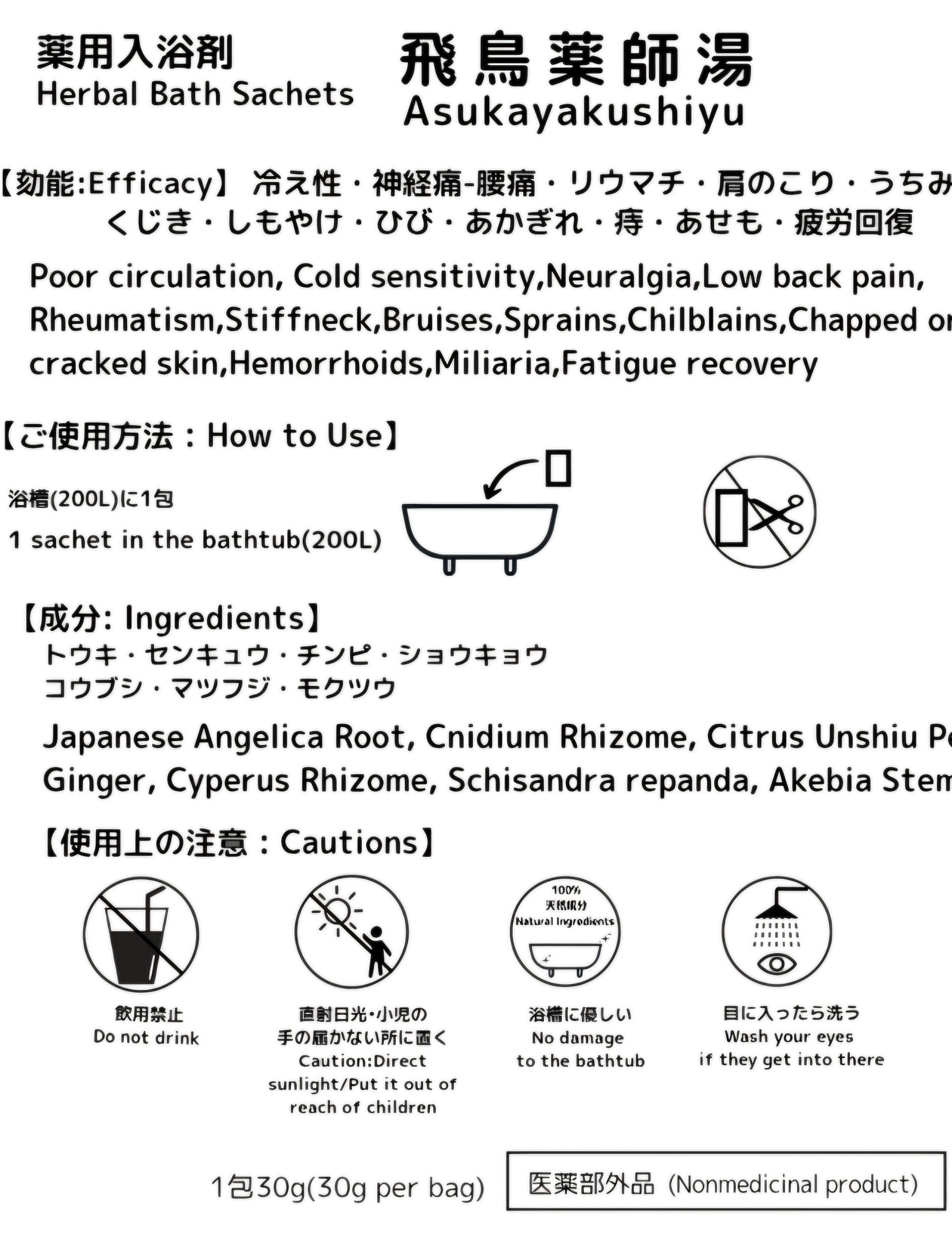 ご家庭のお風呂(約200L)に1包を入れ、湯船の中で軽く揉み出してください。生薬成分がじわじわと溶け出し、薬湯へと変わります。