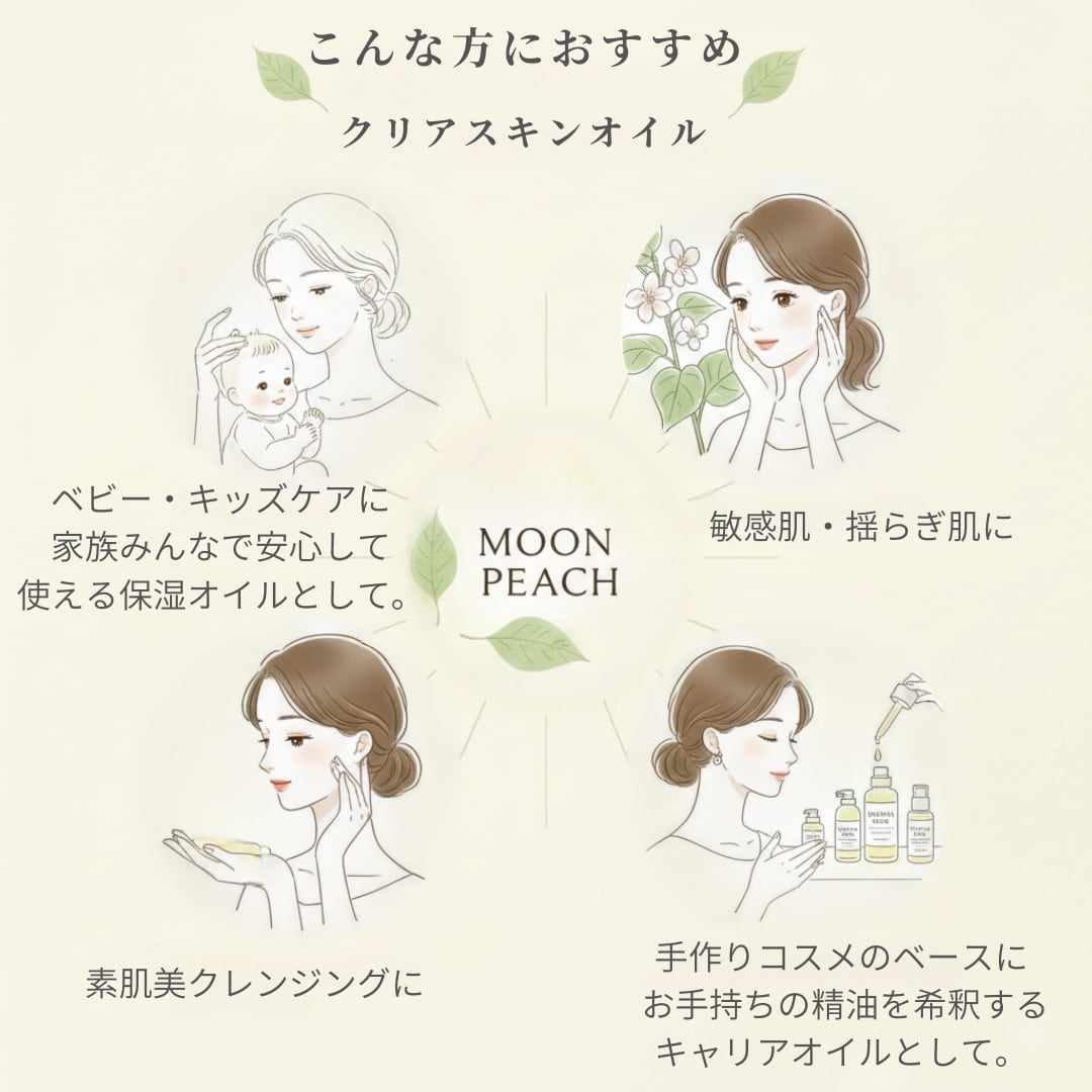 MOON PEACHのオイルは、肌の組成に近い成分を厳選しているため、馴染みが非常に良く、お湯で絞ったコットンで拭き取ることで、余分な油分だけをオフできます。洗顔後は、ベタつきではなく「ふっくらとした柔らかさ」を感じていただけるはずです。